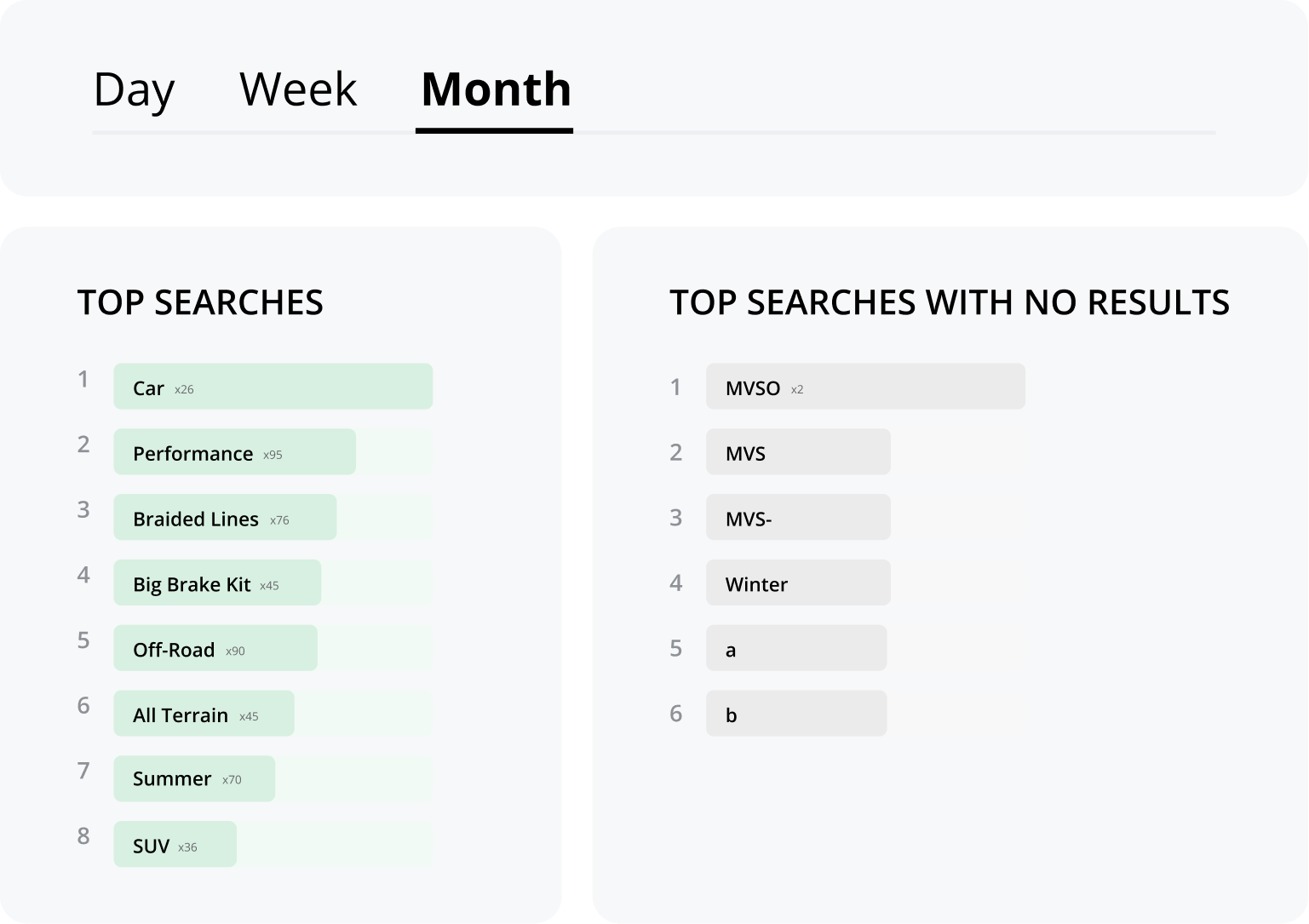 The built-in reports show what visitors are searching for, including popular queries with no results. This helps you update your product range, improve SEO, and optimize product names to boost sales.