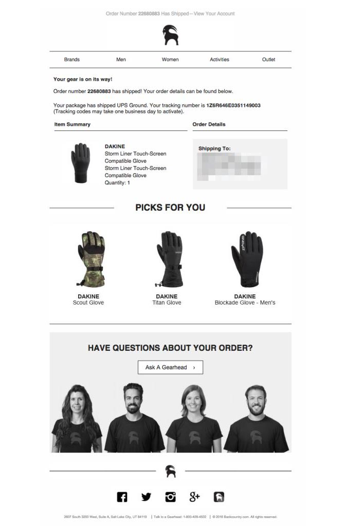 Now take your look at the purchase confirmation email sent by Backcountry, an eCommerce company selling clothing and outdoor recreation gear. No, your eyes are not playing tricks on you. They promote their partners.